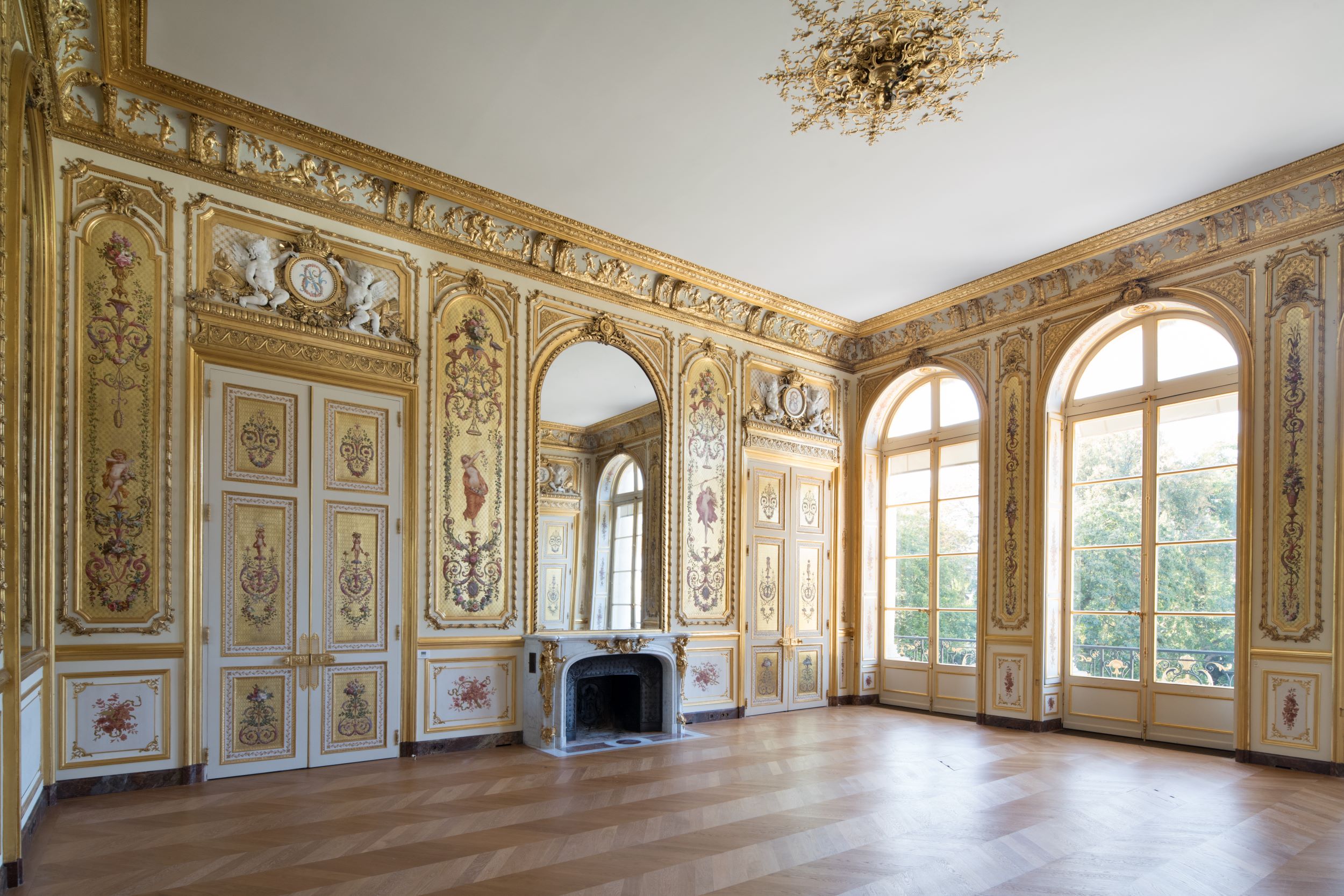 Le salon retrouva ainsi le statut qui fut le sien au 1er Empire sous l’occupation du prince Murat de 1805 à 1808 : un espace de travail dévolu au personnage principal du palais. Les décors du salon doré, exécutés de 1858 à 1862, sont commandés lors de la grande campagne de réaménagement du corps de logis principal de la demeure, voulue par Napoléon III et menée par l’architecte Joseph Eugène Lacroix, en vue de l’installation au premier étage des appartements de l’impératrice Eugénie.