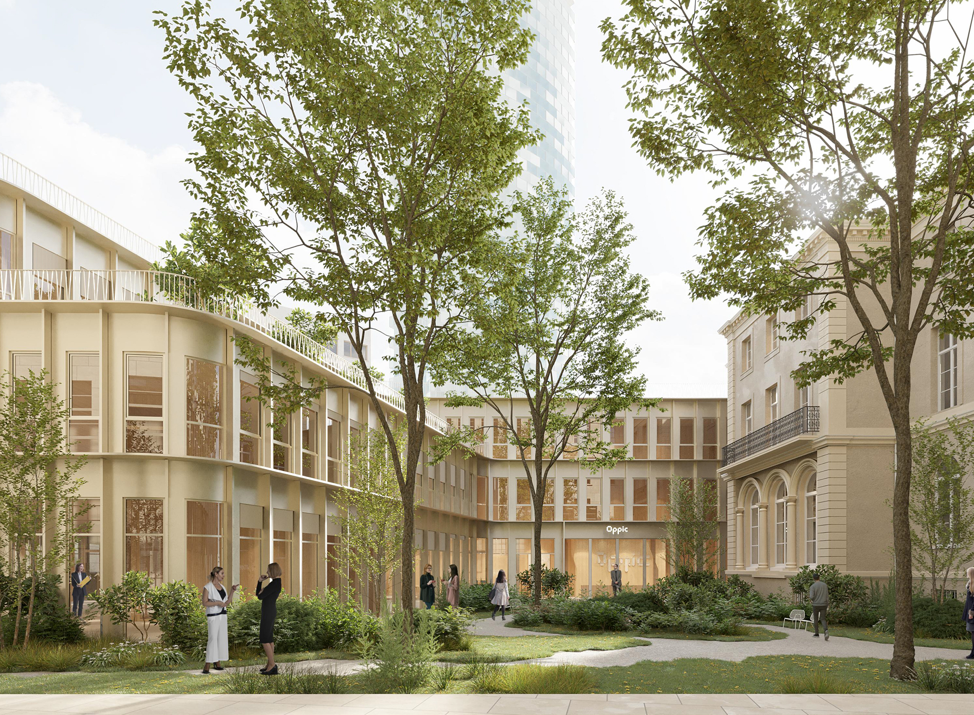 Le nouveau bâtiment se glissera derrière l’Hôtel et se raccordera au nord pour se développer en fond de parcelle autour d’un atrium en forme de V. Tous les équipements et installations techniques seront invisibles et intégrés à la construction pour libérer les toitures et offrir ainsi aux agents de l’Oppic, un îlot agréable à vivre au quotidien.