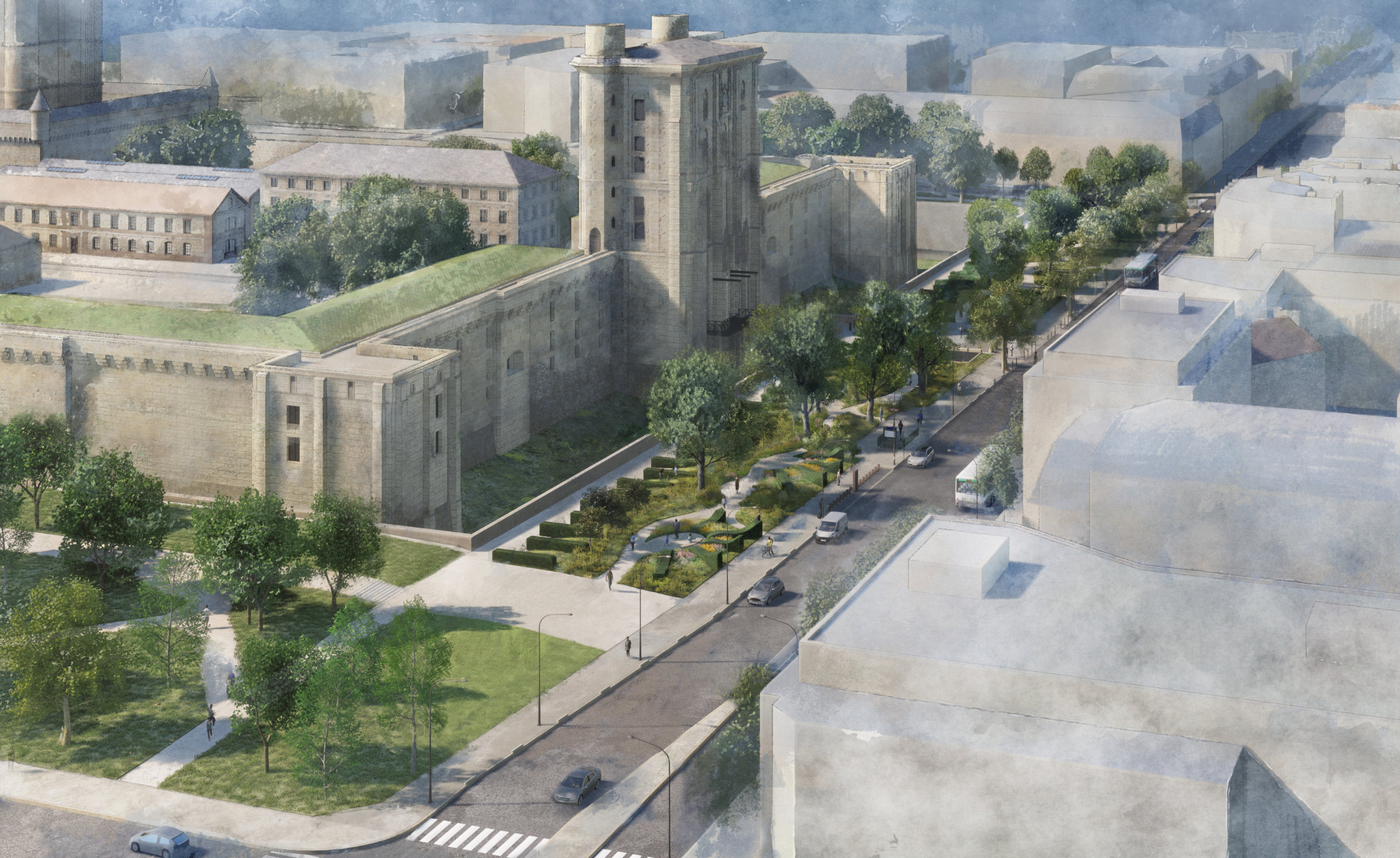 Pour la ville de Vincennes, dont la naissance et le développement sont intimement liés à l’histoire du château, la question de l’aménagement de ses abords est essentielle. Ces parcelles ont fait l’objet d’études successives des architectes en chef des monuments historiques, adaptées au cours des années écoulées à la fois aux contraintes techniques du site et à l’évolution des enjeux climatiques et environnementaux.