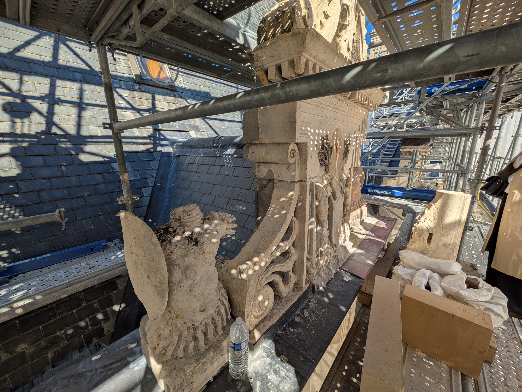 Lancée dans le cadre d’une tranche unique de travaux (2023-2026), l’opération se déploie par ailes successives. Après deux premières phases dédiées aux ailes sud et ouest, c’est l’aile nord qui concentre les efforts des équipes depuis cet été. Ici, les interventions portent essentiellement sur la restauration fine des façades : nettoyage, taille de pierre, menuiseries, peinture et remise en valeur des lucarnes sculptées.