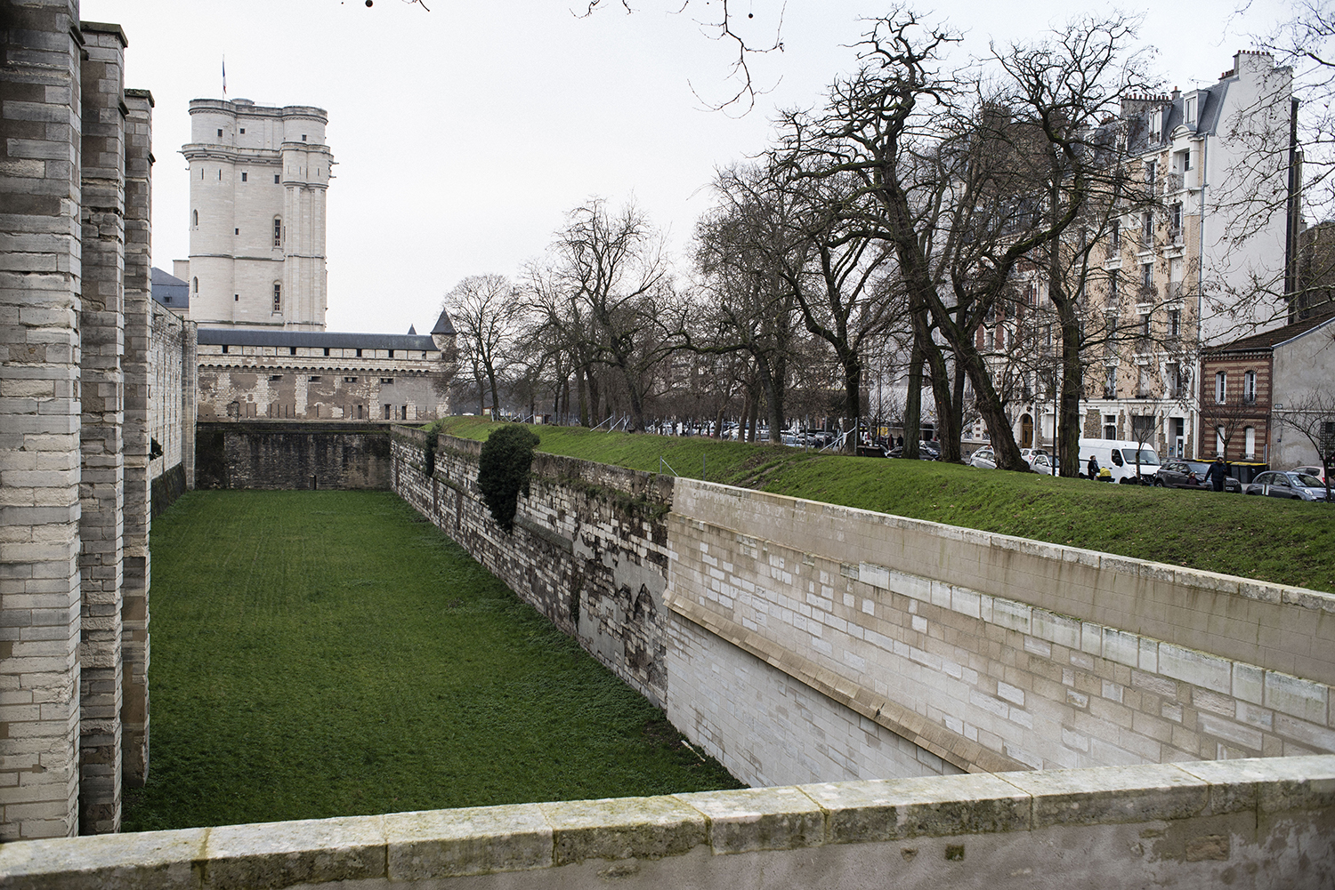 L’enceinte du château de Vincennes a été construite sous le règne de Charles V entre 1372 et 1380. L’ensemble constitué par les murs d’escarpes et de contrescarpes qui délimitent un profond et large fossé périphérique, forme un immense quadrilatère de 390 mètres de long sur 220 mètres de large.