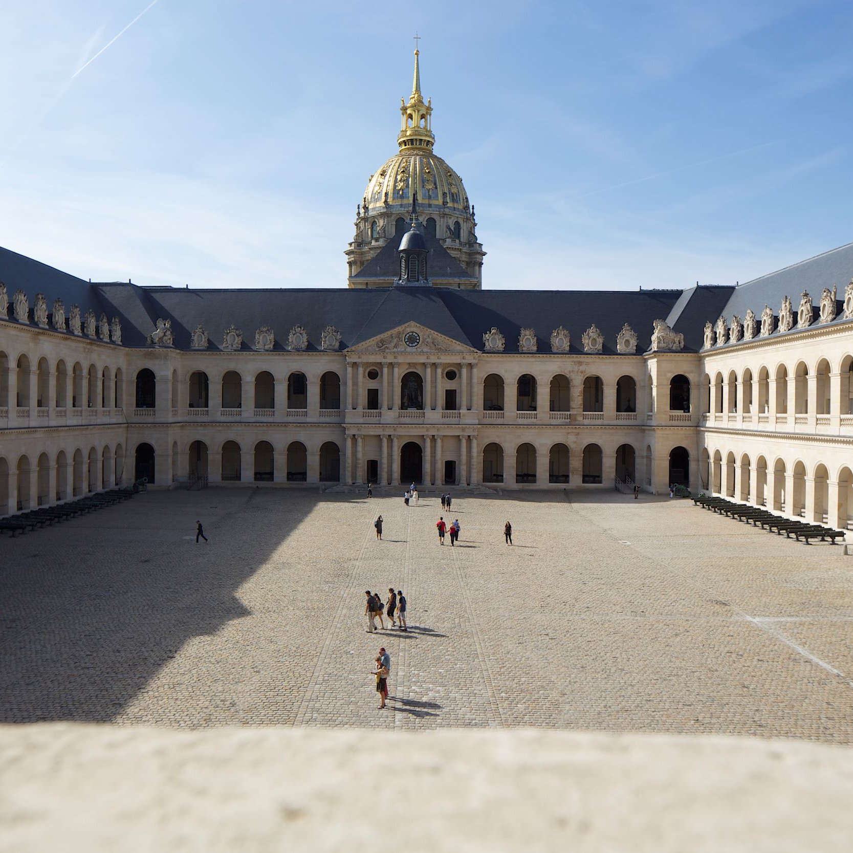 La cour d’honneur est le lieu majeur de l’ensemble du site de l’hôtel national des Invalides. Autour d’un plan rectangulaire, les élévations se composent de deux galeries superposées à arcades en plein cintre, réglées par de forts bandeaux et balustrades, sobrement animées par des (…)