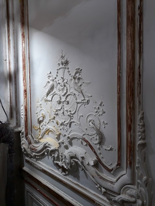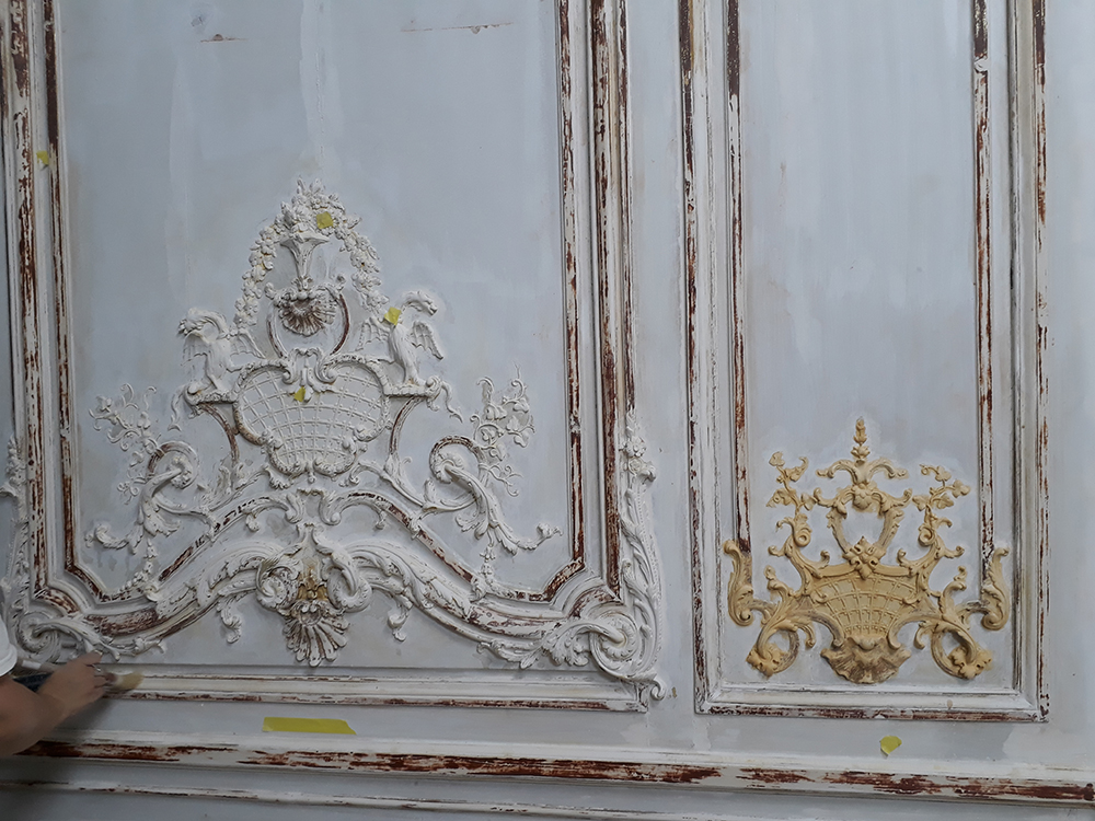 La dorure à la détrempe est une technique utilisée pour la restauration en 2019 du salon des portraits de l’Hôtel d’Evreux.