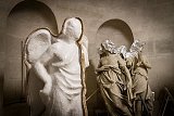 La crypte de l’église tient lieu d’atelier pour la restauration des anges et la réalisation des modèles en plâtre. Les originaux avant la prise d’empreinte.