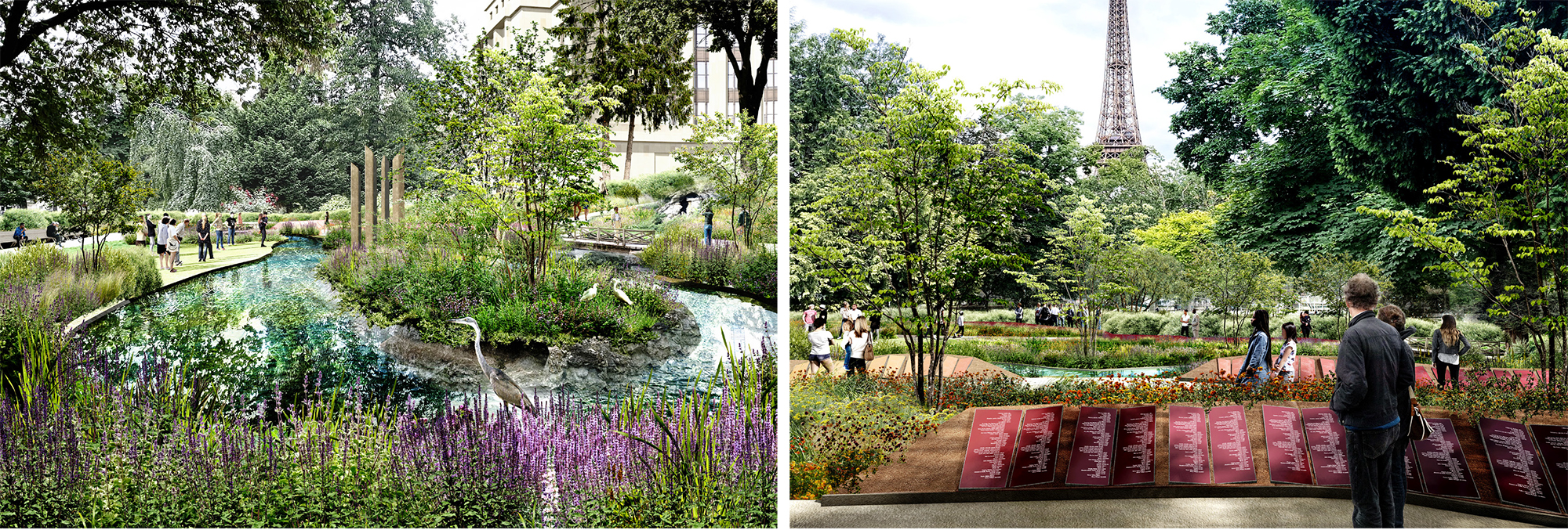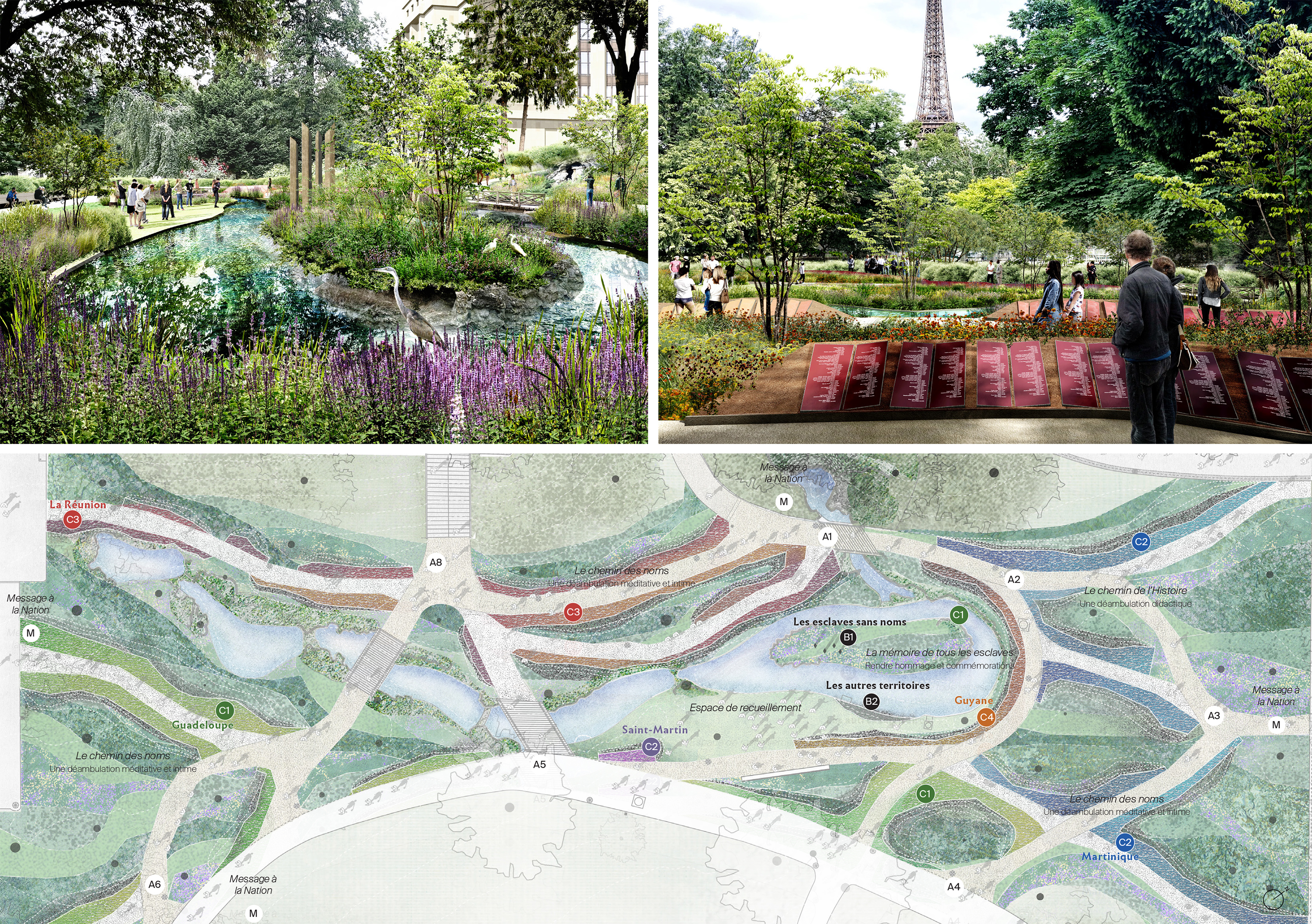 Le projet prévoit l’implantation de plaques en lave émaillée, sur lesquelles seront gravés les noms et prénoms des personnes affranchies en 1848, le long des cheminements existants ainsi que de nouveaux tracés, en bordure de la rivière artificielle du jardin, dans un cadre paysager enrichi par l’introduction de nouvelles strates végétales.